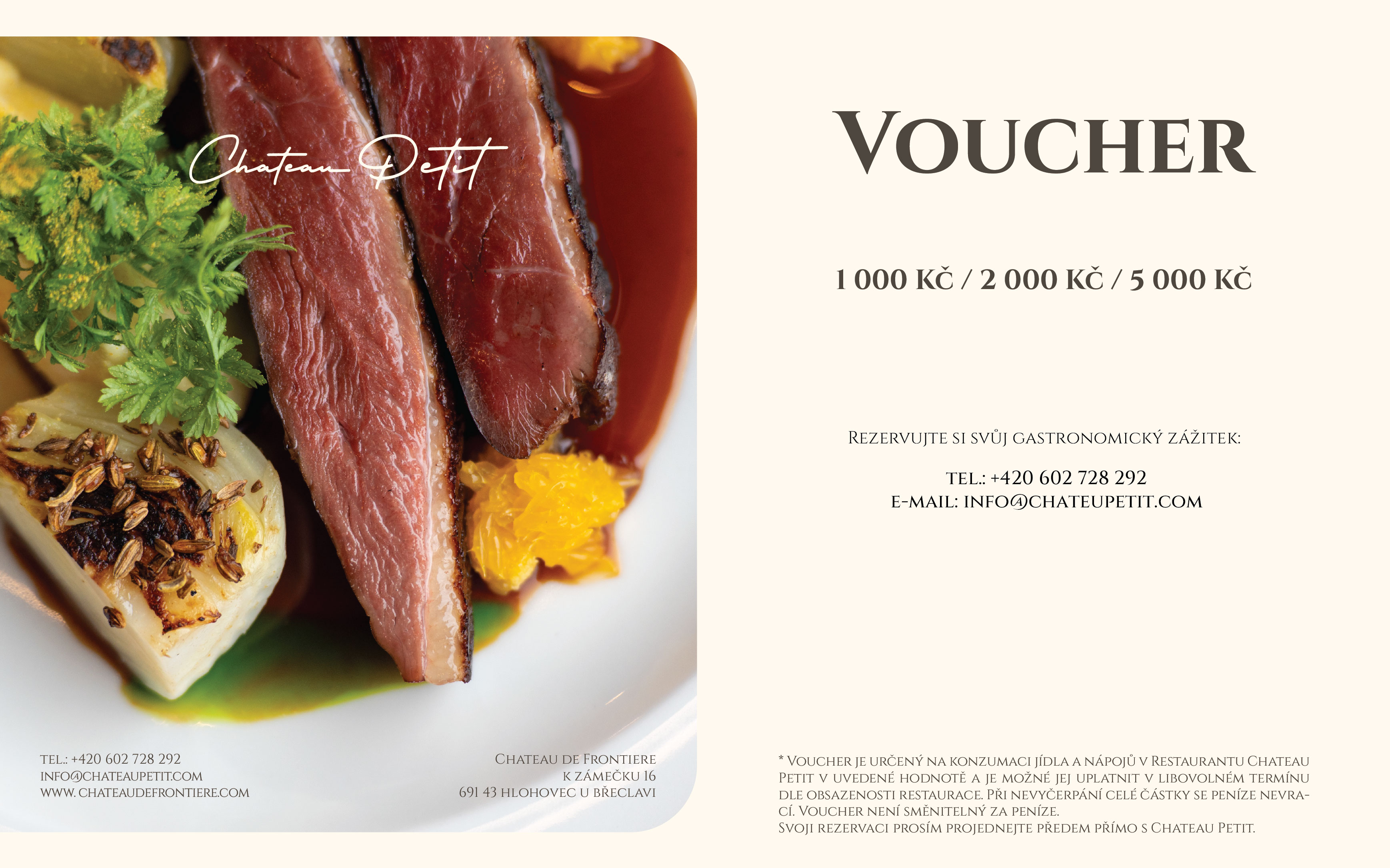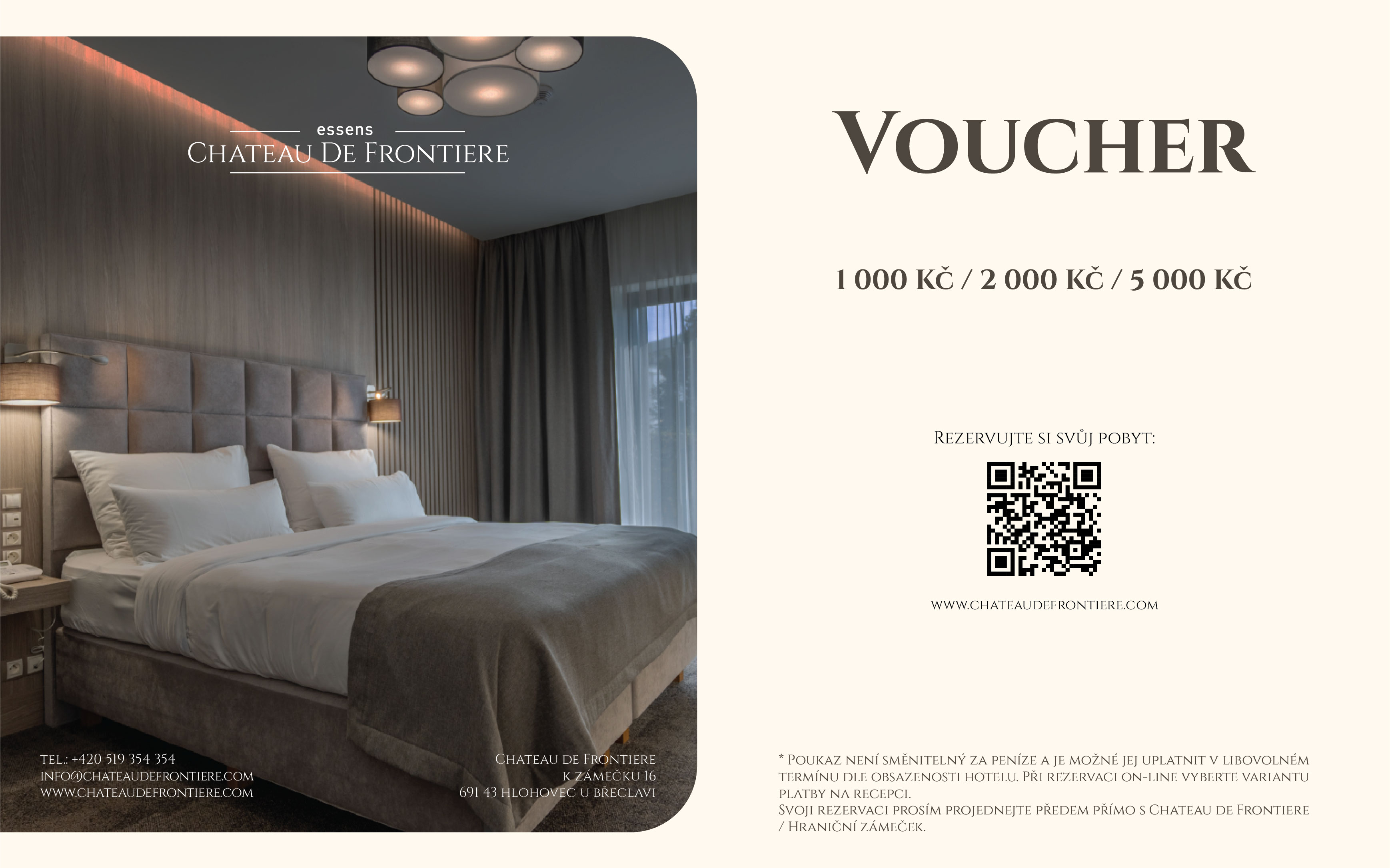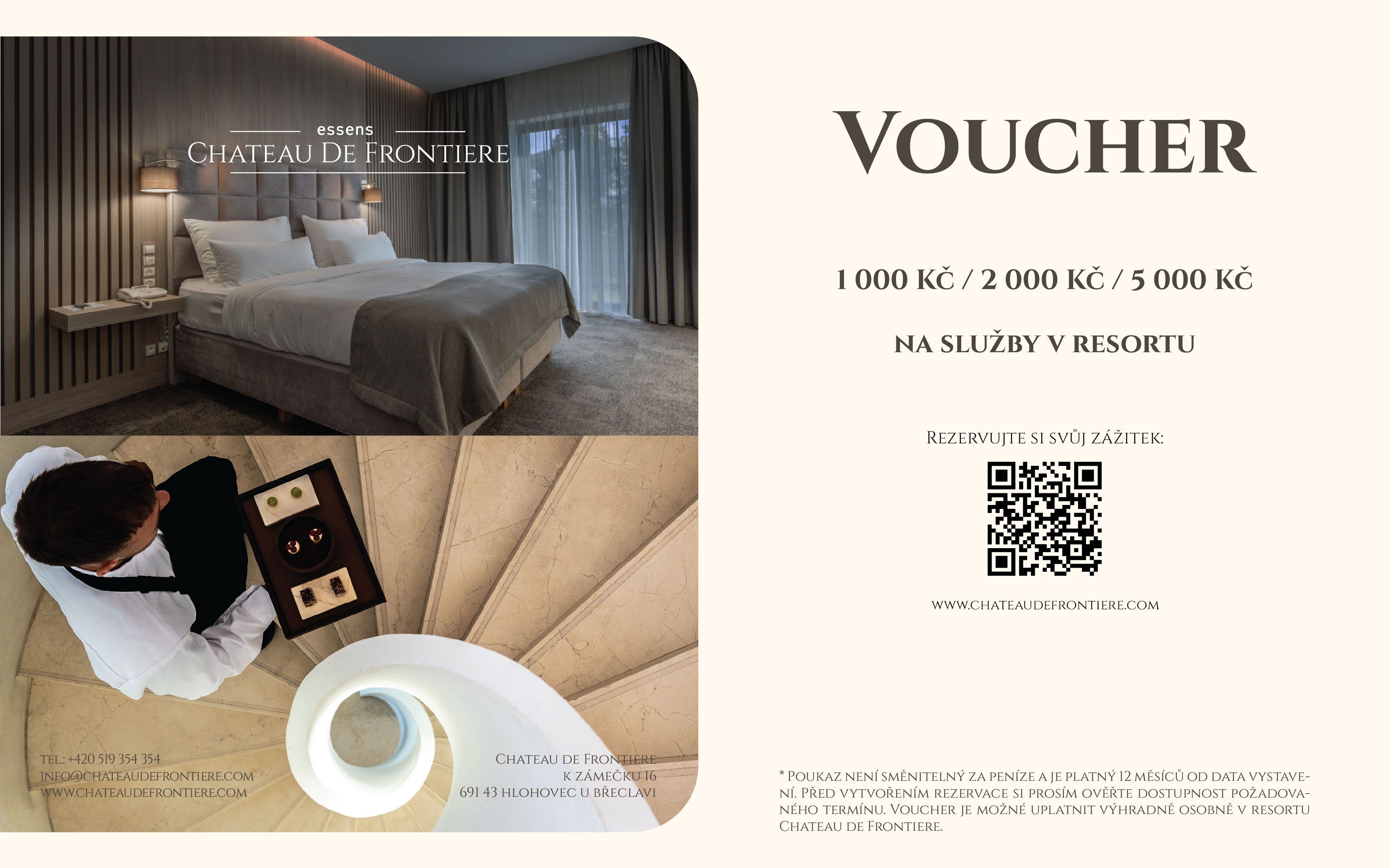 Darujte nezapomenutelné chvíle v resortu Chateau de Frontiere. Dárkový poukaz v hodnotě 1 000, 2 000 nebo 5 000 Kč je uplatnitelný na ubytování v hotelu, v restauraci Chateau Petit i v ESSENS Restaurant.
